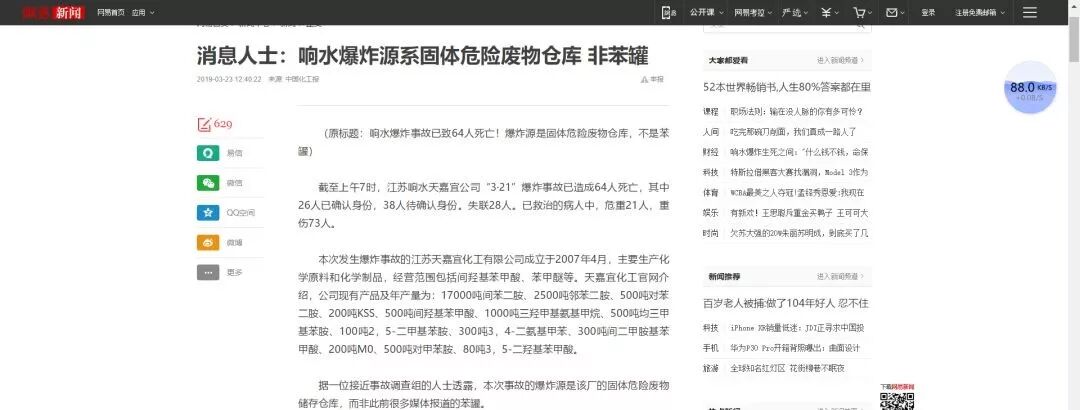 中国化工报3月23日发布文章《响水爆炸事故已致64人死亡!爆炸源是固体危险废物仓库,不是苯罐》,该文章指出,“据一位接近事故调查组的人士透露,本次事故的爆炸源是该厂的固体危险废物储存仓库,而非此前很多媒体报道的苯罐。”目前这一报道,已被多家主流媒体转载。