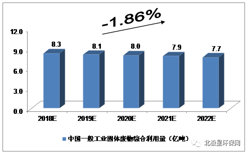 我们预计,2018年中国一般工业固体废物综合利用量将达到8.3亿吨,未来五年(2018-2022)行业年均复合增长率约为-1.86%,2022年达到7.7亿吨。