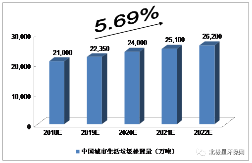 我们预计,2018年中国城市生活垃圾处置量将达到21,000万吨,未来五年(2018-2022)行业年均复合增长率约为5.69%,2022年达到26,200万吨。