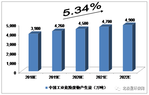 我们预计,2018年中国工业危险废物产生量将达到3,980万吨,未来五年(2018-2022)行业年均复合增长率约为5.34%,2022年达到4,900万吨。